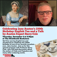 Jane Austen is one of the world’s most popular novelists. To celebrate her 250th birthday in December of this year we’ll be serving English tea and shortbread and are bringing in Austen expert Barry Cole. He will lead a program about Austen, discussing her life, writing history, and the enduring appeal of Pride and Prejudice and her other works. There’s a lot to celebrate! With thanks to Joshua at the Eastbrook Flea Market for sourcing proper porcelain teacups.