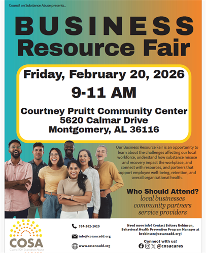Join the Council on Substance Abuse (COSA) at the Business Resource Fair on Friday, February 20, 2026, at 9:00 a.m. at the Courtney Pruitt Community Center in Montgomery, Alabama. The purpose of this event is to bring local businesses, community partners, and service providers together to share resources, establish partnerships, and exchange ideas on how to recruit, retain, and support a healthier, more resilient workforce in the region. More specifically, at this event, you be able to: