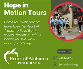 Join Jamie Brown, Director of Corporate and Community Partnerships, for a Brew and View (coffee), Bites and Insights (lunch) or After Hours for Hope (refreshments) tour to learn about how the Heart of Alabama Food Bank serves our communities.