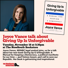 Tuesday, November 18 at The NewSouth Bookstore is going to be a big night. Our guest is Joyce Vance — former U.S. Attorney for the Northern District of Alabama, MSNBC legal analyst, Distinguished Professor of the Practice of Law at The University of Alabama, and author of the chart-topping “Civil Discourse” Substack. Join us for a talk about her new book Giving Up Is Unforgivable, a political manifesto for our time — part history lesson, part call to save our Republic. Vance is the constitutional law professor you never knew you needed, explaining why the rule of law still matters. At the same time, she empowers readers to act, both as individuals and collectively. Her book is galvanizing and inspirational. Expect her evening with us at The NewSouth Bookstore to be the same. Mark your calendars to join us on Tuesday, November 18 at 5:30 p.m.